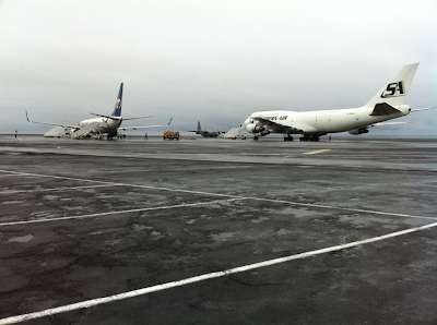 Na foto abaixo, ao fundo, vemos um C130 militrar americano. Os restantes são civis que esperavam escalar outra "base" que existe nas Lajes: a Aerogare Civil das Lajes, gerida directamente pela Direcção Regional dos Transportes Aéreos e Marítimos da Secretaria Regional da Economia do Governo Regional dos Açores. Esta infraestrutura aeroportuária, acopolada à base militar, é obrigada a cobrar as mesmas taxas que os restantes aeroportos em seu redor. No entanto, está longe de ter os mesmos custos operacionais (não tem serviço de socorros, manutenção de pista etc) e tira, imoralmente, partido da capacidade de fornecimento de combustíveis lá sediada, por via dos serviços instalados para as forças militares americanas.
